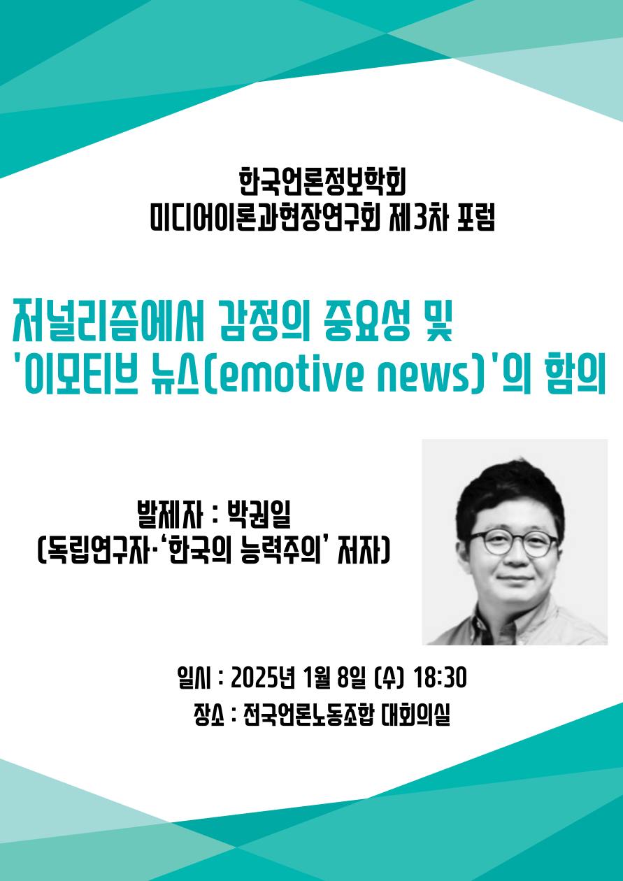 2. 한국언론정보학회의 '미디어 이론과 현장 연구회'에서 오는 1월 8일 포럼을 개최합니다. 포럼과 관련한 안내를 다음과 같이 보내드리오니, 회원 여러분의 많은 관심을 부탁드립니다.