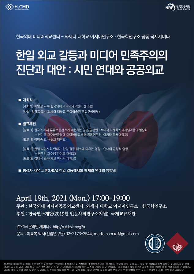 한국외대 미디어커뮤니케이션연구소 산하 「미디어외교센터(H.CMD)」(NRF인문사회중점연구소)에서 ‘한일 외교 갈등과 미디어 민족주의의 진단과 대안: 시민연대와 공공외교’라는 주제로 세미나를 개최합니다. 이번 세미나는 일본 와세다대학 아시아연구소, 한국학연구소와 공동으로 개최합니다. 향후 한국외대와 와세다대학의 연구 기관은 한일 갈등의 실체를 드러내고, 대안을 모색하는 국제연구 협력을 진행하고자 합니다.