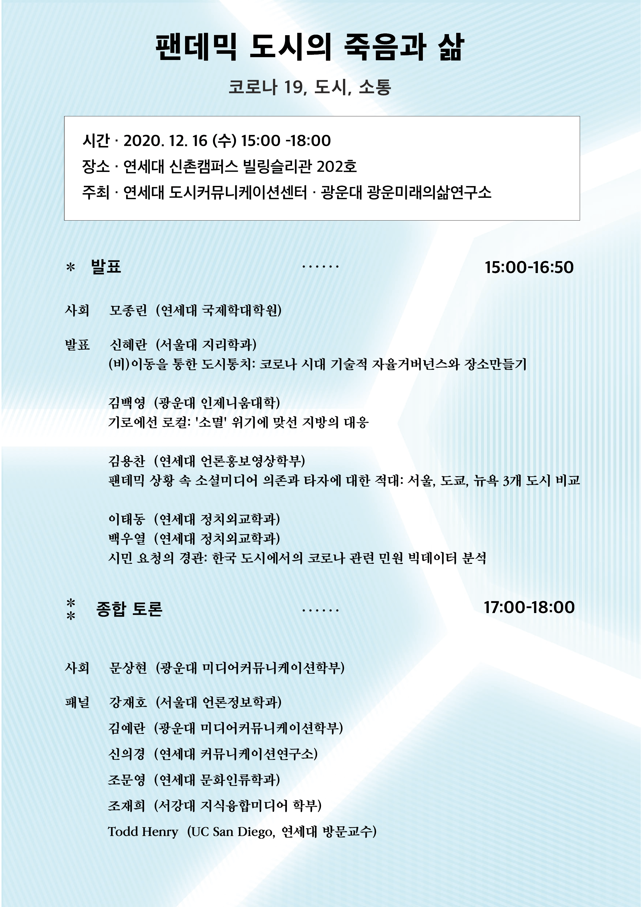 2. 한국언론정보학회는 연세대학교 도시커뮤니케이션센터(센터장 김용찬)와 광운대학교 광운미래의삶 연구소(소장 김예란)가 공동주최하는 <팬데믹 도시의 죽음과 삶: 코로나 19, 도시, 소통> 세미나를 다음과 같이 안내하오니, 회원 여러분의 많은 관심을 부탁드립니다. 감사합니다.